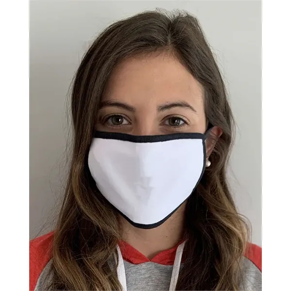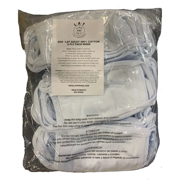 LAT 100% Cotton 2-Ply Face Mask ul)4.5 oz./yd2, 100% combed ringspun cotton jersey mask. Ribbed cotton binding across the top, bottom and ear holes ensure comfortable all day wear. Two-ply. Washable/ Reusable. Breathable. Ideal for DTG, heat transfer, 1-color screenprint, and pad print. Sold in poly-bagged packs of 50 face covers. 1 unit = 50 face covers.. One size fits most6 3/4" W x 4 5/8" L*Specs do not include the ear loops Care: Wash before wearing.100% breathable 2-ply cotton holds up to extended washes and wear.Wash to sanitize after wearing. Dry completely in dryer for form fit after each use.Individuals should be careful not to touch eyes, nose and mouth when removing face mask and wash hands immediately after removing.