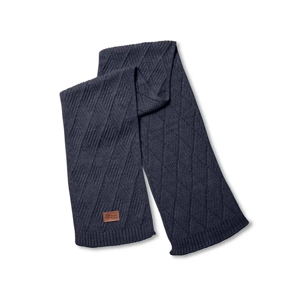 Heathered Rayon, Fiber, Polyester and Nylon blend scarf knitted on a trellis pattern. Includes a faux Leather Thermo PU patch and measures 1.96"w x 1.18"h. Hand-wash only. Do not iron.