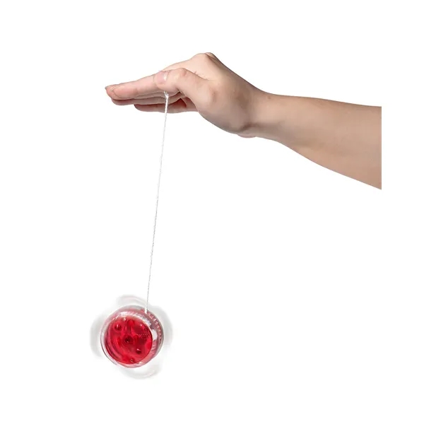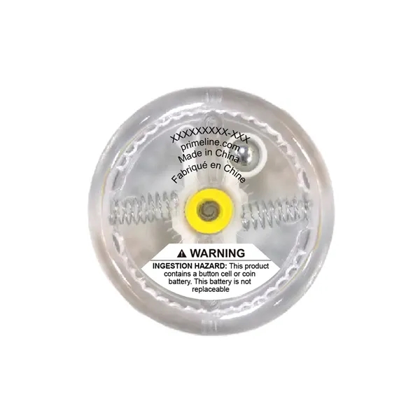 Yo yo with translucent PS Plastic exterior, featuring red blinking light. Lights up while yo yo is in use. Uses 2-piece LR41 button cell batteries, inserted, and replaceable.