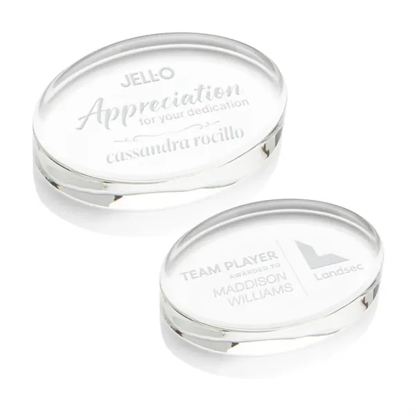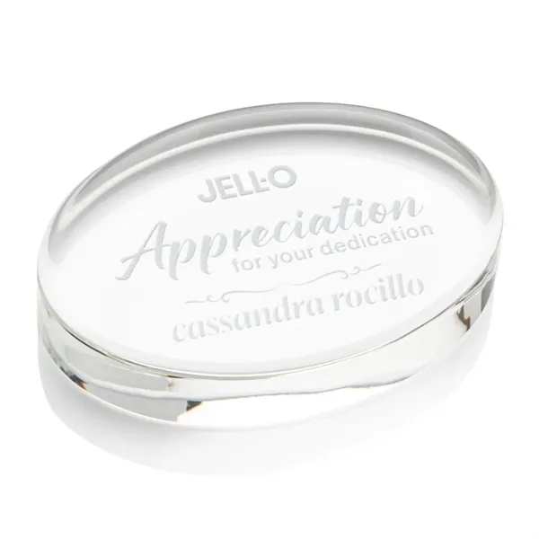 The Logan Oval Paperweight combines sleek design with practical elegance, making it a refined addition to any desk. Made out of smooth Starfire Crystal, its curved shape adds a touch of sophistication while keeping important documents in place.
