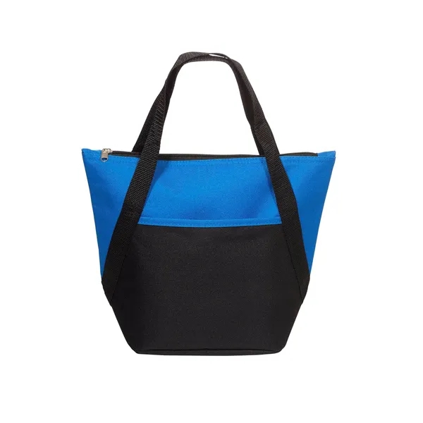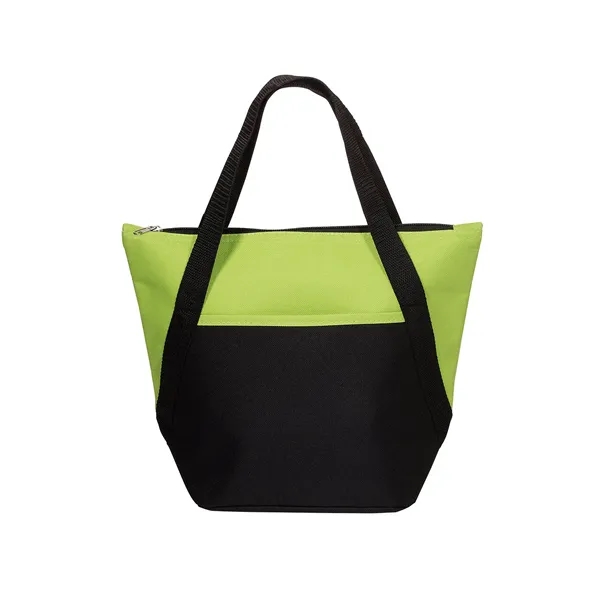 Ideal for a a snack or lunch. Insulated 600D Polyester tote bag with PE padded aluminum foil insulation. Features top zipper closure, black carry handles and and black front open pocket (approx. 11"w x 7"h at widest points). Handles measure approx. 18"l x 1"w. Holds nine 12 oz. cans. Recommended weight tolerance: 22 lbs.