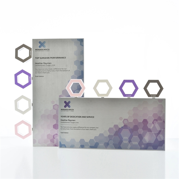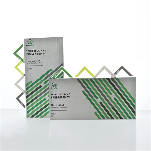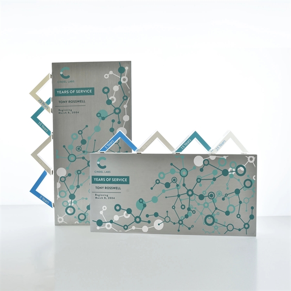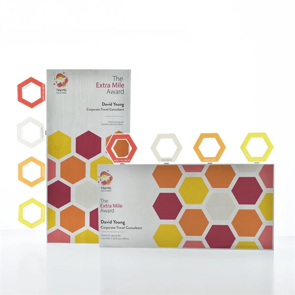 Discover the Magnetism award: a sleek, heavy-duty aluminum rectangle offering ample space for custom digital prints. Personalize your award with magnetic attachments in various shapes, each customizable with your design. Perfect for celebrating milestones or years of service, Magnetism lets you bring your vision to life. Enhance your recognition game with this versatile, stunning award.