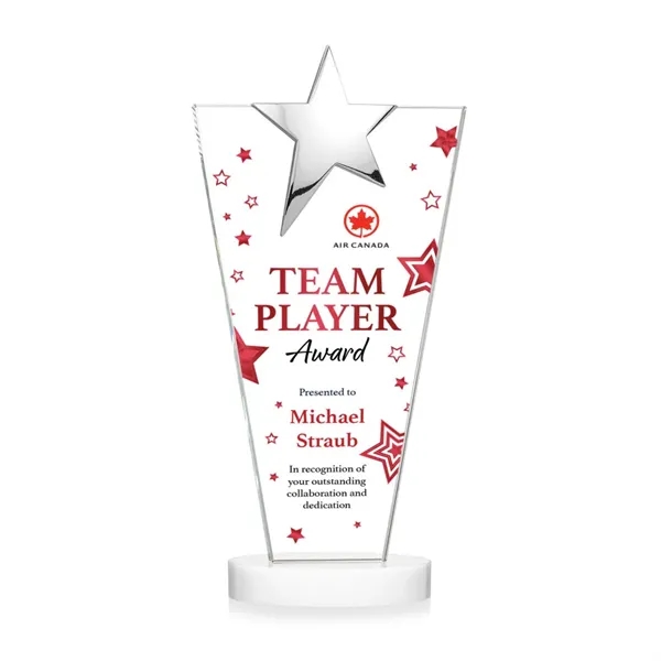 The Optical Crystal Mantella Star VividPrint™ Award features a sleek tapered rectangle design accented by a brilliant chrome or gold star at the top. Mounted on a clear oval optical crystal base, this award radiates prestige and celebrates stellar achievement. Bring your artwork to new heights with full-color VividPrint™!