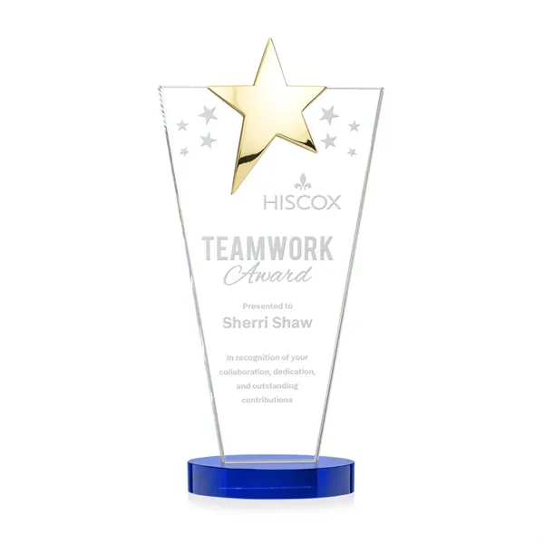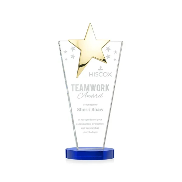 The Optical Crystal Mantella Star Award features a sleek tapered rectangle design accented by a brilliant chrome or gold star at the top. Mounted on a clear oval optical crystal base, this award radiates prestige and celebrates stellar achievement.