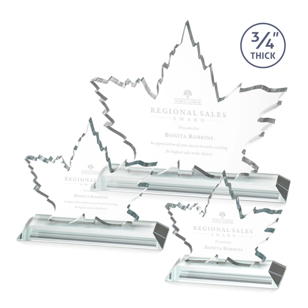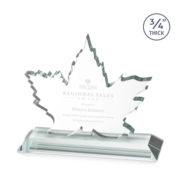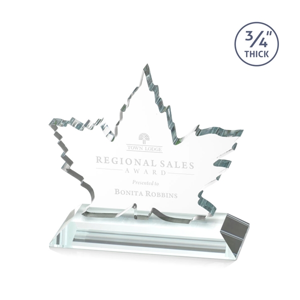 Stunning Starfire Crystal formed into a beautiful maple leaf with acid polished edges and mounted on top of a Clear mitered base. A great symbol of Strength, Perseverance and Canadian Pride. Let your message POP with full color VividPrint™.