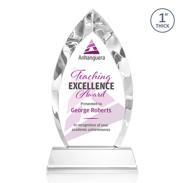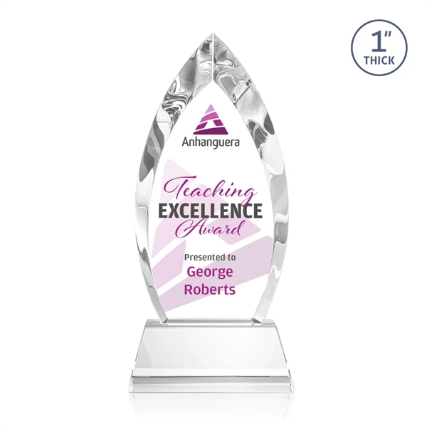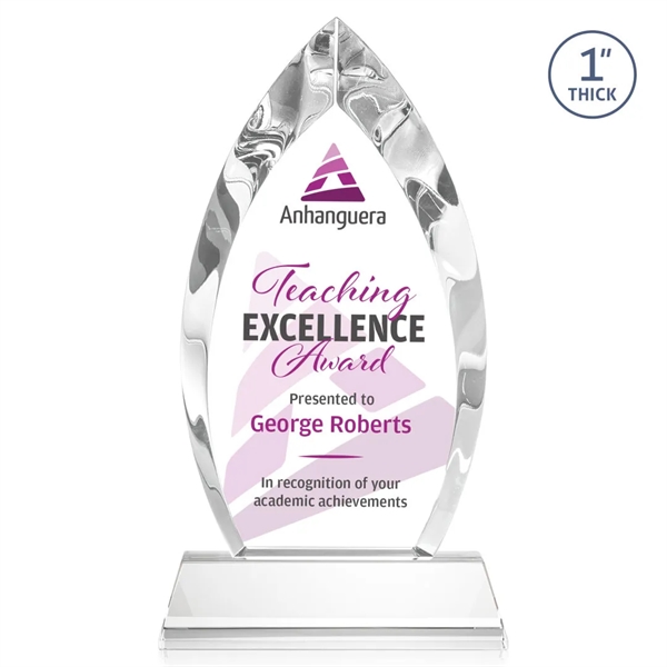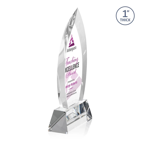 Make a statement of distinction with the Optical Crystal Marinello VividPrint™ Award on base, boasting deep bevels that exude elegance. The color crystal accent at the bottom of the awards reflects throughout the award captivating attention and adding a unique touch to any recognition ceremony. Matching base available in your choice of 9 different colors. Presented in a sleek black satin-lined gift box. 2nd position on base is optional.