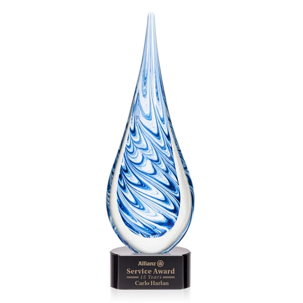 Unique swirls of blue and white make up a work of art that is the Marlin Award! This teardrop-shaped art glass comes complete with a complimenting base for personalization. The Marlin Award is truly a grand piece that the recipient will cherish for a lifetime. Each piece is individually Hand-crafted and no two pieces are identical.
