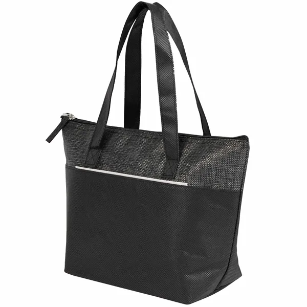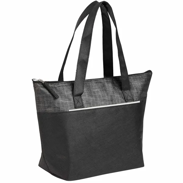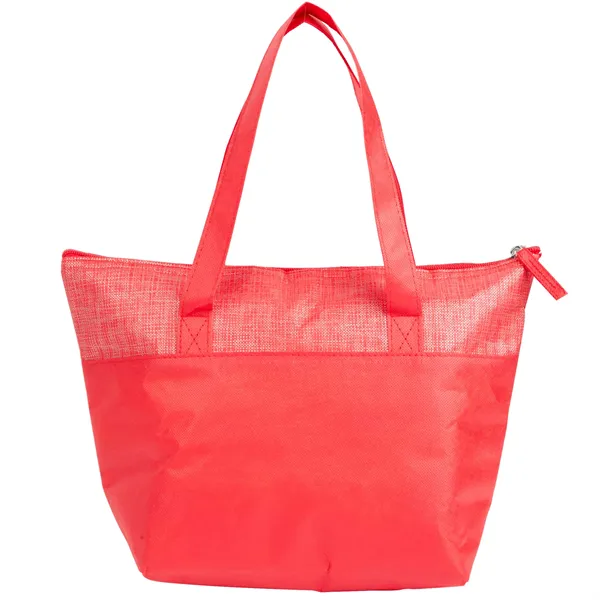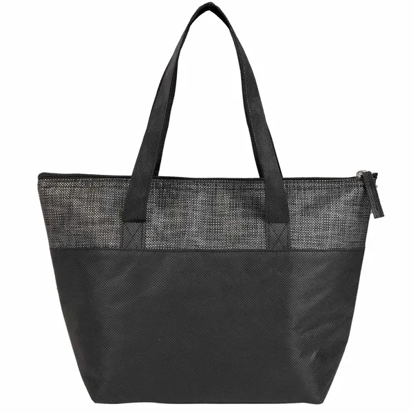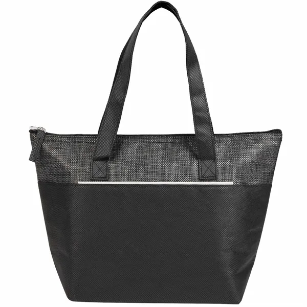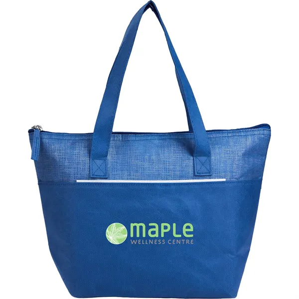 The Mist Recycled 9-Can Non-Woven Tote Cooler is a bold, eye-catching option for keeping your meals fresh on the go. With a unique print and a 9-can capacity, this cooler is perfect for picnics, lunches, or outings. Made from recycled materials, it features a foldable style for easy storage, a front pocket for extra items, and a zipper closure to keep contents secure. The foil lining with 2mm foam insulation helps maintain the temperature of your food and drinks. By choosing this cooler, you're making a positive impact on the environment through a partnership with 1% For The Planet, as a portion of each sale supports environmental nonprofits.