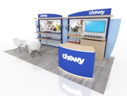 Getting noticed at a trade show starts with a beautiful exhibit. The VK-1135 and VK-4053 displays are attractive custom modular designs with practical features. Those include shelves, monitor mounts, large format graphics, and locking storage. Both the 10 and 20 ft. versions have LED accent lights with programmable RGB lights on the custom reception counter.
