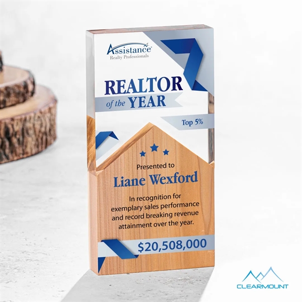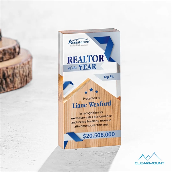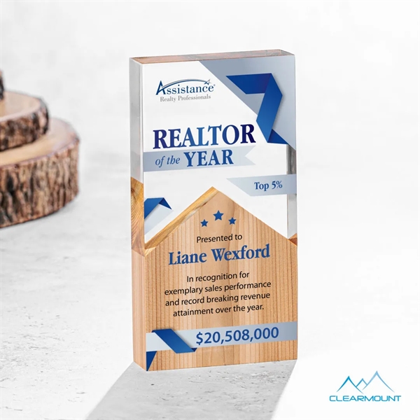 Bring a touch of natural craftsmanship to your awards program. The Montagnes VividPrint™ Award features a unique composition, showcasing a top half crafted from hand-poured lucite and a bottom half sculpted from wood converging into a peak shape. Take your artwork to new heights with full-color VividPrint™.