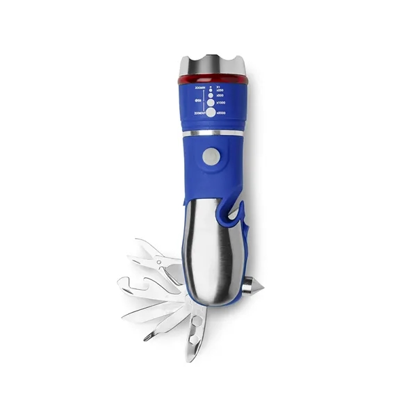 You'll always be prepared with this multi-function emergency tool and flashlight. Tools included: knife, bottle and can opener, scissors, Philips head screwdriver, Flathead screwdriver with duo large/small hex screwdriver, hammer (i.e. glass breaker), seat belt cutter, flashlight. Light includes multiple functions including an emergency light and dual mode flashlight (strobe and zoom modes). Contains one COB light with 80 lumens. Uses 3AAA batteries, included and replaceable. Instructions included. Gift box measures approx. 2" x 2" x 6.125".