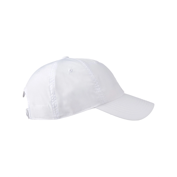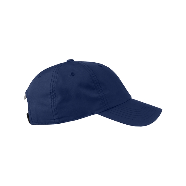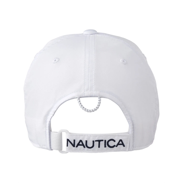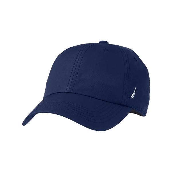 Elevate your casual look with the timeless style and functionality of the Nautica Hudson 6-Panel Cap. It's made of 93% polyester and 7% spandex and the relaxed, unstructured silhouette conforms comfortably to your head for all-day wear. Features include Nautica inside taping, an embossed J-Class logo on the back hook and loop strap and embroidered signature J-Class logo on the left side. The back closure with an elastic white and navy cord allows for a personalized fit. Sold unimprinted.