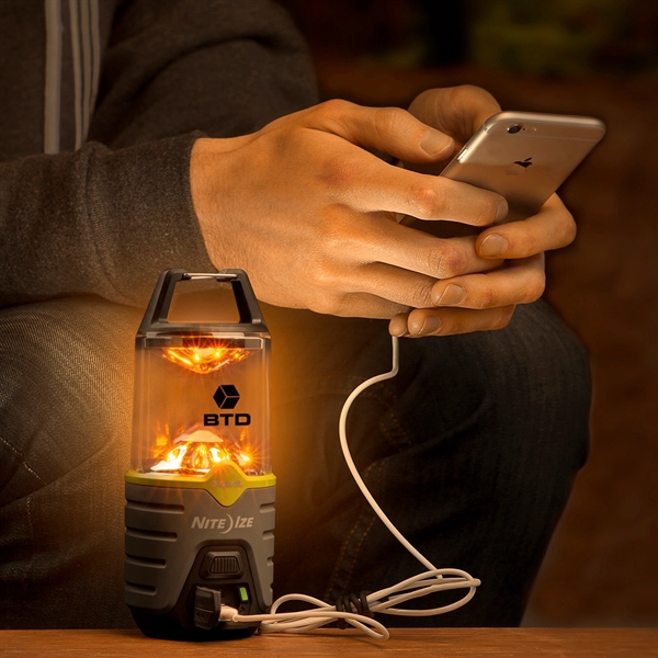 The Radiant® 314 Rechargeable Lantern has a built-in powerbank with a USB output port allows you to charge small devices wherever you go. Featuring 314 lumens of bright white light, and an amber mode for warm light that emulates a flame. This durable lantern is impact and water resistant (IPX4), has 4 light modes (low, meidum, high, amber) and features a built-in carabiner clip, making it easy to clip, carry, and hang. Powered by a rechargeable lithium ion battery that charges using a micro USB cable (included), this lantern can run up to 96 hours on a single charge. Pad print 1-2 colors. (Price includes 1 color, upcharges apply for second color).