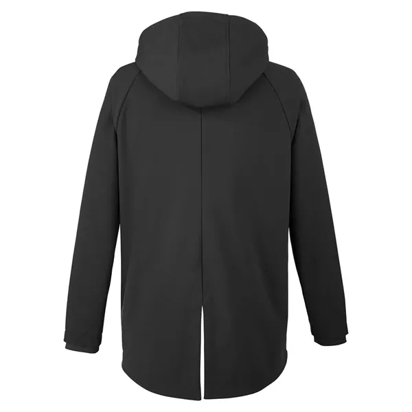 North End Women's City Hybrid Soft Shell Hooded Jacket ul)8.5 oz./yd2 (US), 14.2 oz./L yd (CA) 95/5 nylon/spandex taslon . Bonded to 100% polyester jersey. Water-repellent. Winsmart technology. Removable hood. Dyed-to-match stretch interlock at cuffs. Center front vislon zipper with auto-lock slider. Lower pockets with snap closures. Longer length with back vent detail.