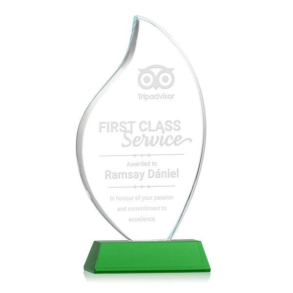 This classic award features a 3/4" thick Starfire Crystal Flame with rounded edges and mounted on your choice of clear or colored tall tapered Optical Crystal Newhaven Base. An elegant award to recognize a great achievement or momentous event. Packaged in a black satin-lined presentation gift box. Second position etch and colorfill optional.