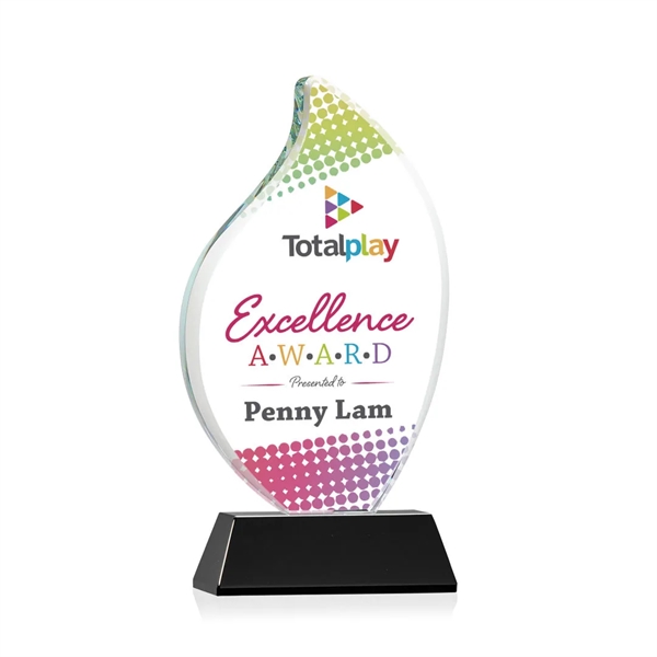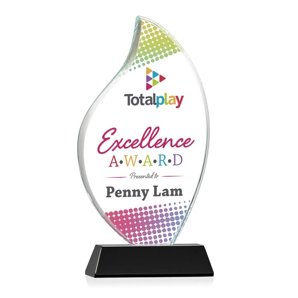 This classic award features a 3/4" thick Starfire Crystal Flame with rounded edges and mounted on your choice of clear or colored tall tapered Optical Crystal Newhaven Base. An elegant award to recognize a great achievement or momentous event. Let your logo and message POP! with full color VividPrint™! Packaged in a black satin-lined presentation gift box. Second position imprint optional.