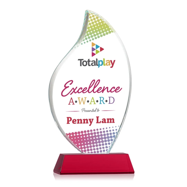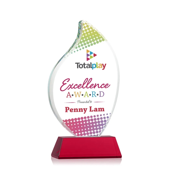 This classic award features a 3/4" thick Starfire Crystal Flame with rounded edges and mounted on your choice of clear or colored tall tapered Optical Crystal Newhaven Base. An elegant award to recognize a great achievement or momentous event. Let your logo and message POP! with full-color VividPrint™! Packaged in a black satin-lined presentation gift box. Second position imprint optional.