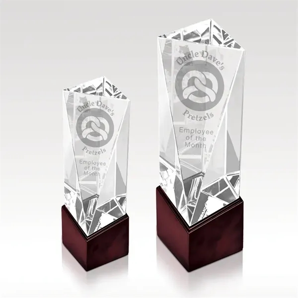 The grandeur of the Optic Balboa is obvious from all of its many angles. This tower of optical crystal glistens bright against the lustrous cherry finished piano wood base.