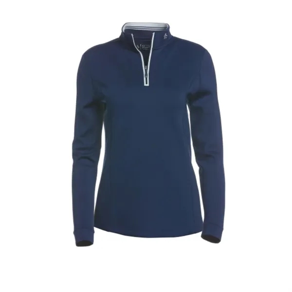 The Original Penguin® Clubhouse Women's 1/4 Zipper Corporate Pullover is the perfect solution for staying warm and stylish on cooler days. Crafted from soft high-gauge fleece with added stretch, this golf pullover offers both warmth and flexibility for your game. The mock neck features a convenient quarter zip closure with contrast piping for a sleek look. It's an ideal base layer for chilly days on the course, combining comfort with performance.