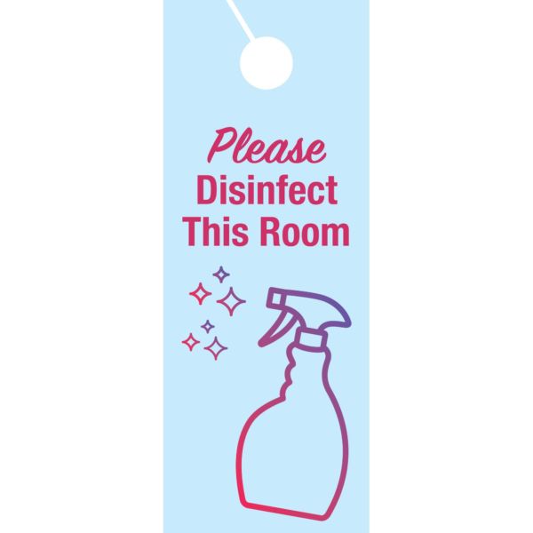 - Blue door hanger features imagery of disinfectant cleaning spray