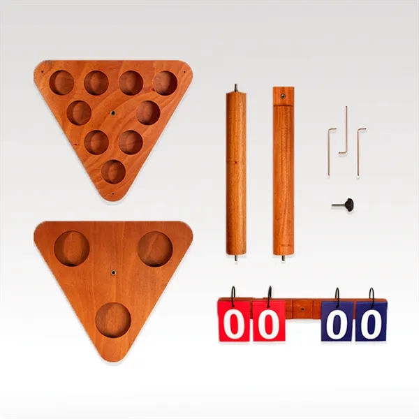 This finely-crafted Portable Scoring Tower features stained, handcrafted mahogany and premium solid wood. It packs up easily for games on the go with minimal assembly. The cup holders are perfect for your drinks, and the sturdy base includes three stakes and rubber feet for stabilizing your tower on soft or hard surfaces.