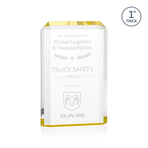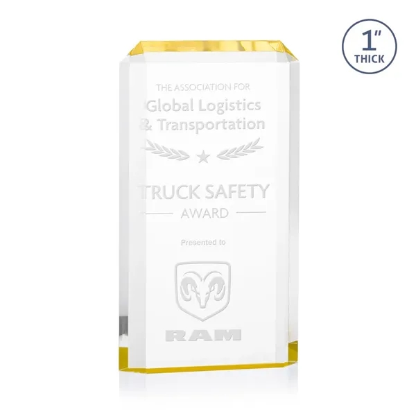 The freestanding acrylic Powell Award is a striking tribute, featuring a choice of reflective sapphire, gold, or ruby bottoms that beautifully highlight each bevel with vibrant color. This award's sleek design and brilliant hues make it an eye-catching piece for honoring exceptional achievements. Celebrate excellence with the Powell Award, where elegance meets brilliance.