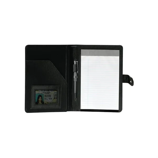 President - Stitched PVC Junior Size Padfolio. Looks like leather! Snap closure. Inside flap pocket, elastic pen loop ( pen not included). 1 business card pocket. Includes lined pad of paper 5 x 8 ( 40 sheets). 61/2 x 8 3/4.