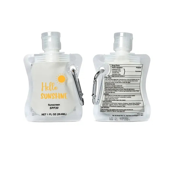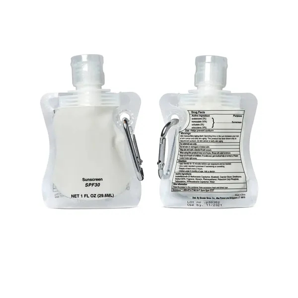 1 oz. (295 mL), SPF 30, PE plastic;Sun protection on-the-go in this collapsible bottle; Light vanilla scent; Active ingredients: Octinoxate, Octisalate, Oxybenzone, Titanium Dioxide; Includes metal carabiner for easy attachment to accessories; Shipping available to U.S. addresses only excluding Hawaii or Key West, Florida; Product Size: 2.875" w x 4.25" h x 1" d; Blank (unimprinted) orders are not available for this item;