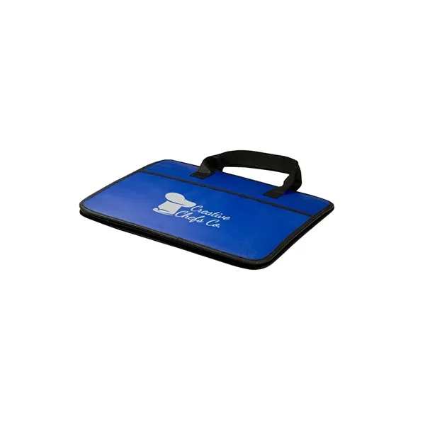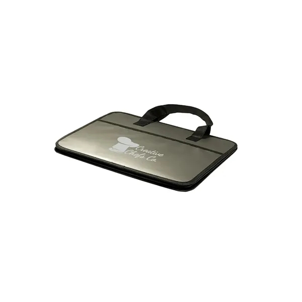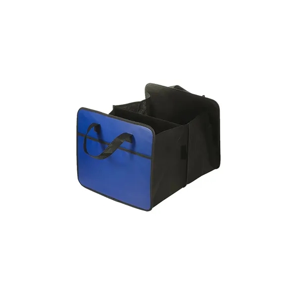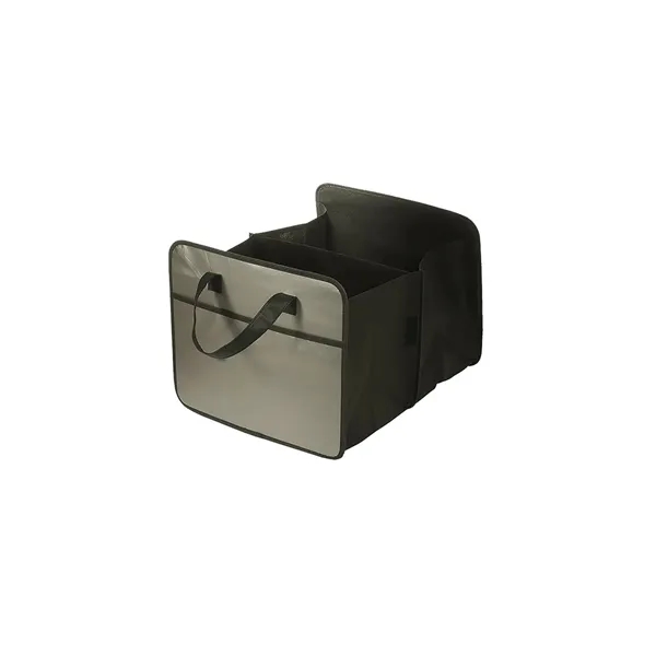 Made from laminated 80 GSM Non-Woven Polypropylene;Folds flat but expands wide with cardboard reinforced center divider; Outer pockets on front and back; Hook and loop fastener adhesive closures along sides to reduce size to a single compartment tote; Recommended weight tolerance: 8.5 lbs; Product Size: 14.25″ w x 12.25″ h x 17.5″ d;