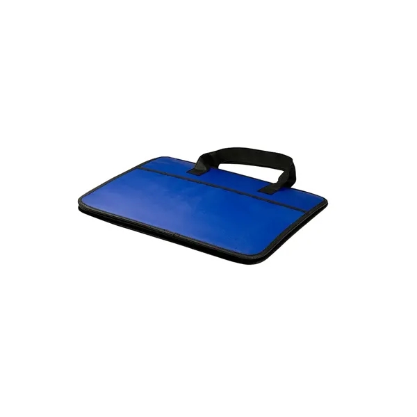 Made from laminated 80 GSM Non-Woven Polypropylene;Folds flat but expands wide with cardboard reinforced center divider; Outer pockets on front and back; Hook and loop fastener adhesive closures along sides to reduce size to a single compartment tote; Recommended weight tolerance: 8.5 lbs; Product Size: 14.25" w x 12.25" h x 17.5" d;