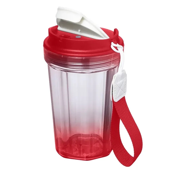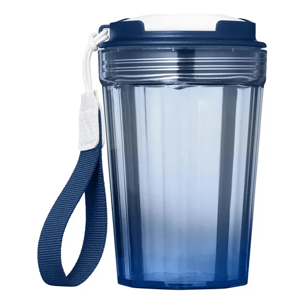 Recycled AS;Stylish carry strap keeps your beverage close at hand wherever your day takes you; Single wall, intended for cold beverages only; Screw-on flip-up PP lid; wrist strap attached to lid; Product size: 5.8″ h x 3.5″ dia.;