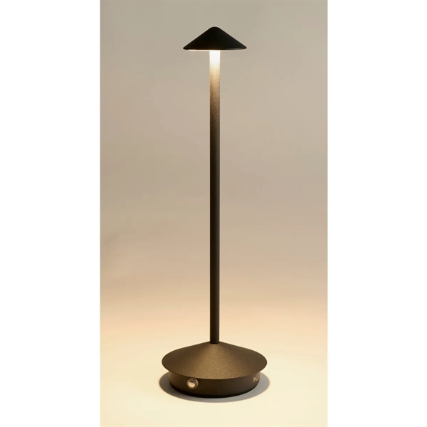 Let there be light while you work, study or play with the power of this pyramid style LED table lamp. Made of powder coated aluminum with a weighted base, this lamp works works with rechargeable action with a non-obstructing view pole and a micro size shade for a powerful downward glow. Battery life ranges from six to 20 hours of use, depending upon dimmer settings. Available in black. Add your school, sports team, organizational or company logo or message to customize.