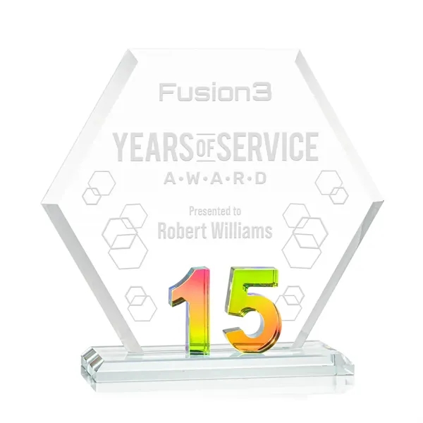 Mark a milestone in your organization with our Starfire Crystal Riviera Anniversary Award. The unique hexagonal design, coupled with beveled edges, creates a modern and sophisticated aesthetic, reflecting the significance of the years served. At the heart of this remarkable award lies captivating prismatic number 15, showcasing the years of significance. Mounted on a clear beveled Starfire Crystal base.