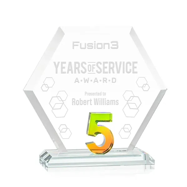 Mark a milestone in your organization with our Starfire Crystal Riviera Anniversary Award. The unique hexagonal design, coupled with beveled edges, creates a modern and sophisticated aesthetic, reflecting the significance of the years served. At the heart of this remarkable award lies captivating prismatic number 5, showcasing the years of significance. Mounted on a clear beveled Starfire Crystal base.