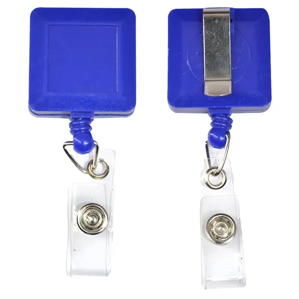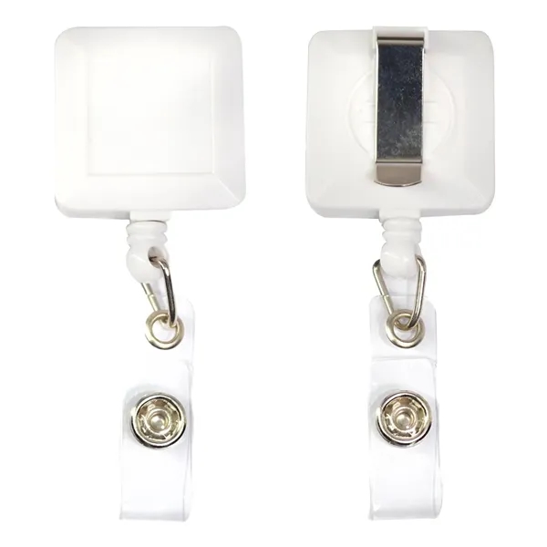 Solid square shaped badge reel with a round body with a 30" retractable nylon cord with plastic adapter base, metal belt clip backing, and durable vinyl snapback strap. Optional full color decal sticker w/ epoxy dome or digital UV print. Available in a varitey of body colors to choose from and free PMS matched imprinting.
