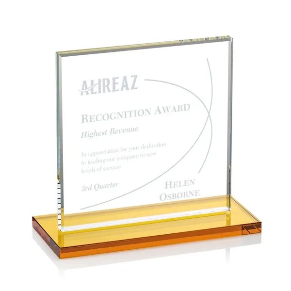 Bold Sahara Award features a 0.5” thick Starfire crystal mounted on a vibrant flat edged colored base for a spectacular work of achievement recognition.