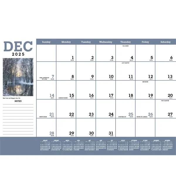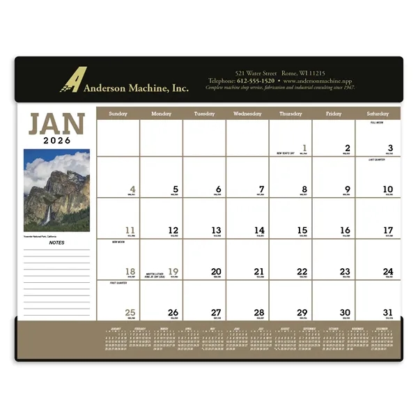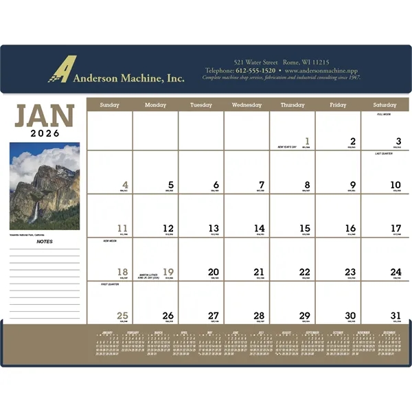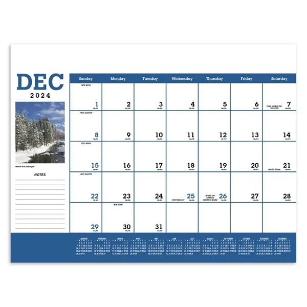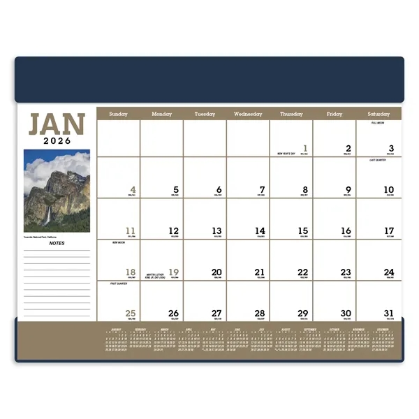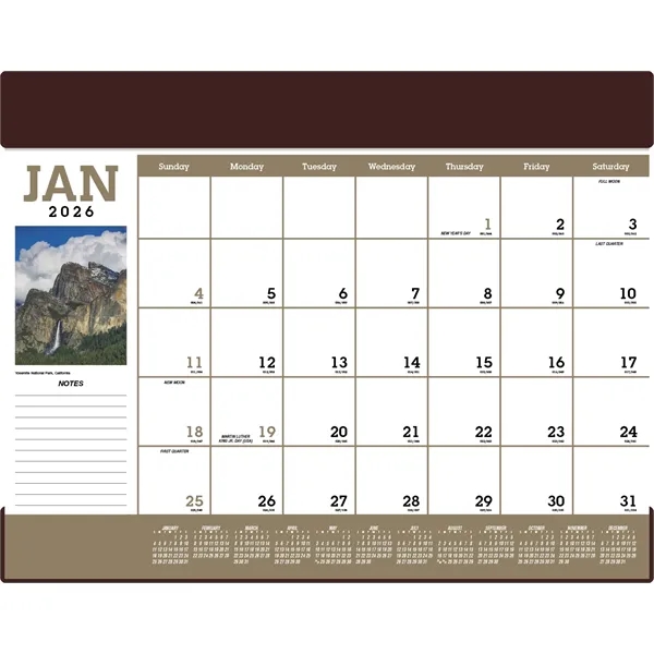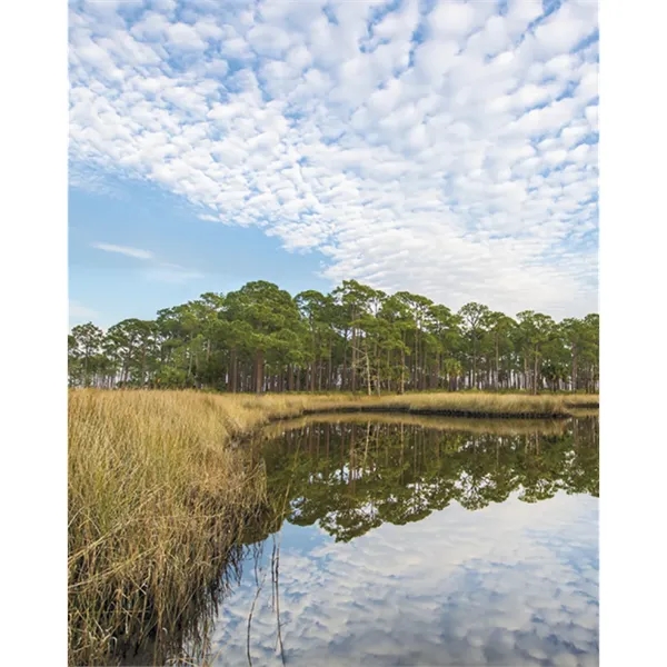 Full-color scenic photographs w/ a hotstamped ad on the heavy Suedene vinyl header make this desk pad stand out. A clear vinyl pocket protects the sheet’s edge, furnishing a hideaway for business cards and memos. The SFI® label means that materials used for this product have been responsibly sourced.