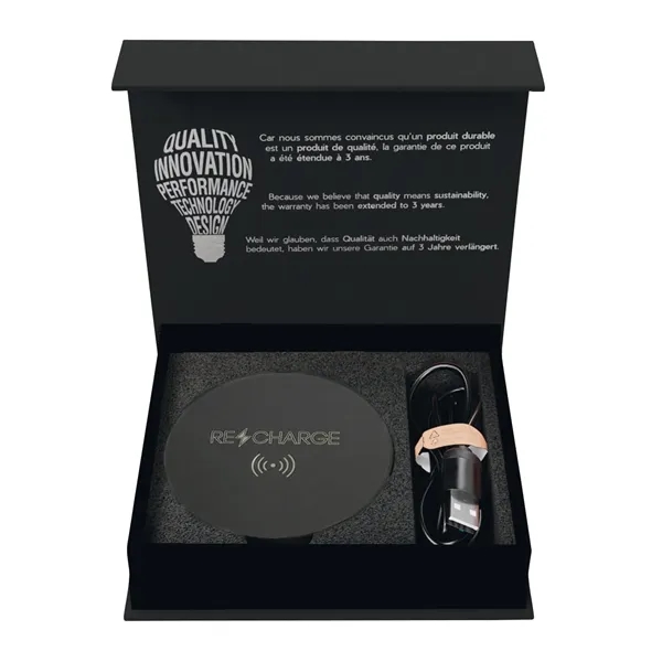 Keep your devices powered and ready to use with this 10W wireless charging station that's compatible with Qi devices. Its illuminated logo adds some extra fun to your desk. Includes an RPET charging cable, premium gift box, and 3-year warranty. Patent pending.