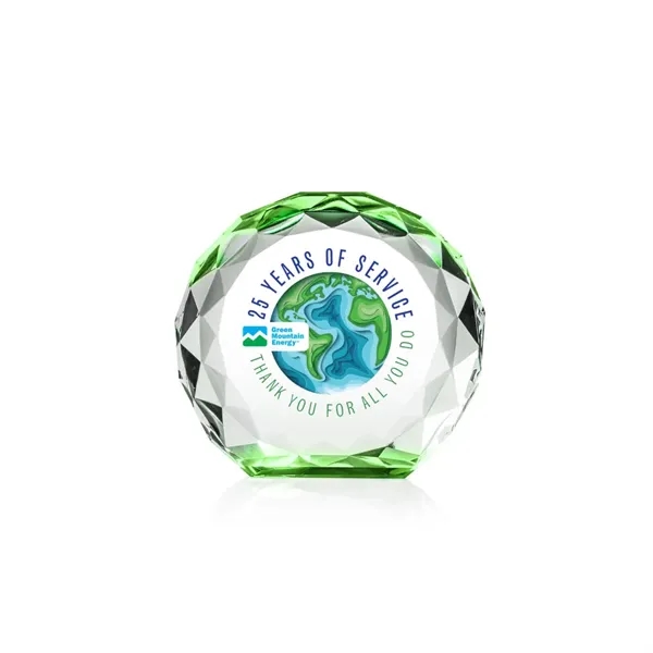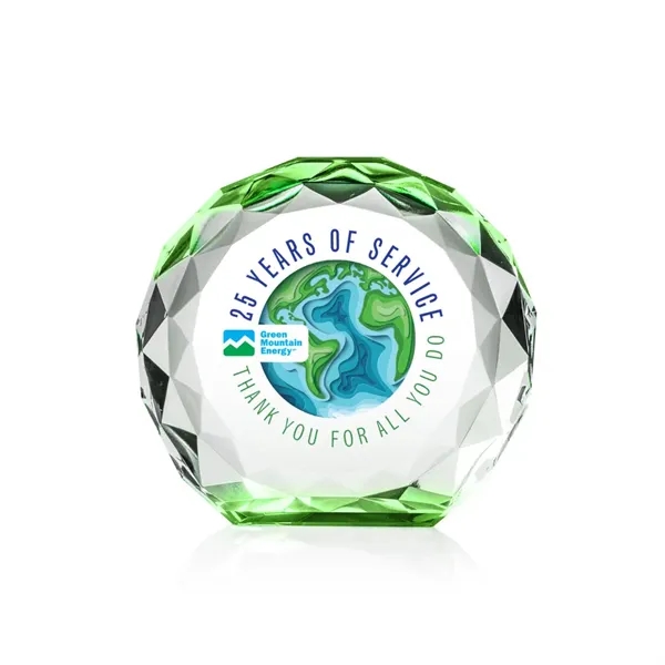 The Seville VividPrint™ Award is a freestanding crystal award with a round, gem-cut shape that beautifully catches and reflects light from every angle. Its colorful base radiates vibrant hues upward, creating a striking prism effect throughout the entire piece. Both elegant and eye-catching, this award is perfect for recognizing milestones and achievements with a touch of brilliance. Bring your design to life with brilliant full-color VividPrint™, adding depth and vibrancy to every detail of your artwork.