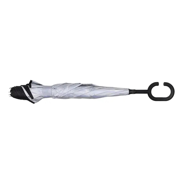 No matter the weather, Shed Rain has you covered. This stylish manual-open umbrella has a rubber-coated C-shaped handle that keeps your hands free as you move about. When closed, it creates a cone to keep you dry when getting in and out of your vehicle or going through a doorway. It features a 48" arc, a steel shaft, fiberglass ribs, and an iridescent accent under the canopy. Shed Rain covers this product with a lifetime warranty (excluding imprint).