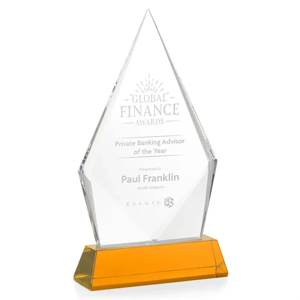 The Optical Crystal Shelton Award on Newhaven base features a striking diamond shape with an elongated peak, symbolizing excellence and ambition. With polished bottom bevels, it makes a bold and elegant statement of achievement. Mounted on a tall tapered optical crystal base.