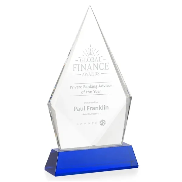 The Optical Crystal Shelton Award on Newhaven base features a striking diamond shape with an elongated peak, symbolizing excellence and ambition. With polished bottom bevels, it makes a bold and elegant statement of achievement. Mounted on a tall tapered optical crystal base.