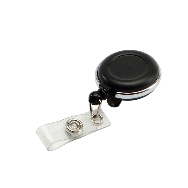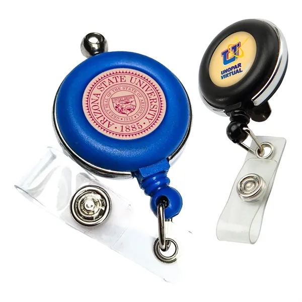 Silver Metal Frame Round Badge Reel Holder with Belt clip and a 24" retractable nylon cord with metal belt clip backing and durable vinyl snapback strap. Optional full-color decal sticker w/ epoxy dome or digital UV print. Available in a variety of body colors to choose from.