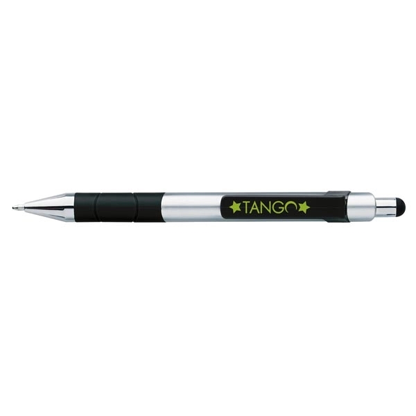 The Rize Stylus Pen features a colorful wraparound clip that includes a cut-out Souvenir® icon and a matching comfortable rubber grip. The sleek silver barrel is topped with a chrome-plated plunger that includes a capacitive stylus for added versatility.