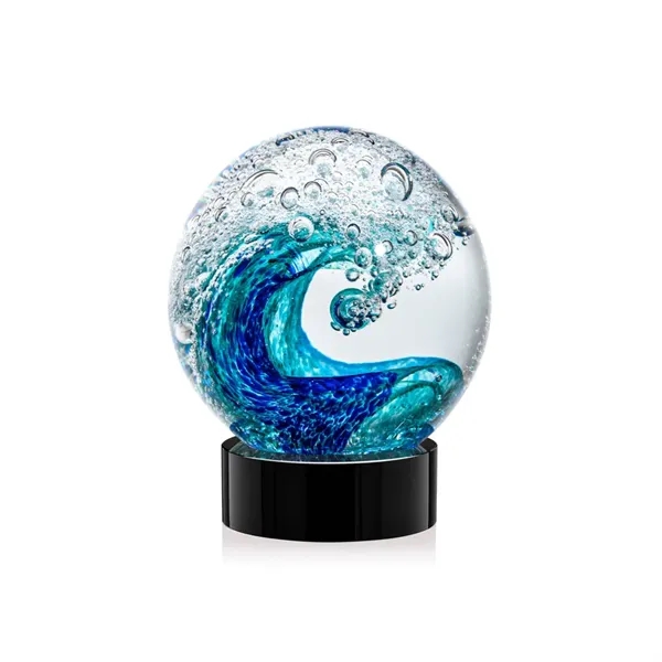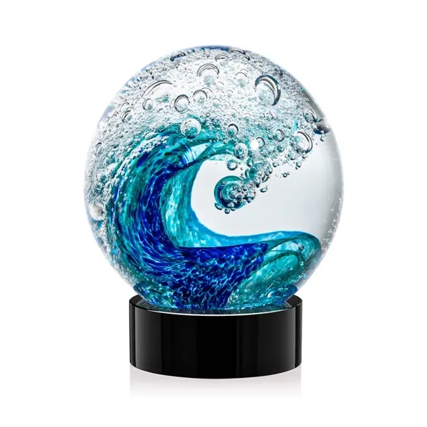 The magnificent Surfside Artglass award features a beautiful crashing blue wave embedded in a perfect sphere. Deep turquoise and sapphire interact with air bubbles to create a powerful and striking display to honor your achievement. Each art glass piece is unique and one-of-a-kind! All sizes are approximate and will vary from piece to piece. Mounted on our Stanrich Base.