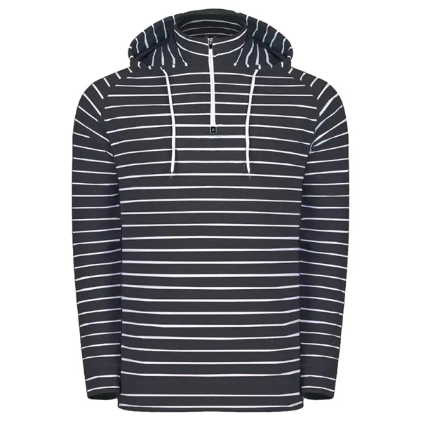 Polyester, cotton, spandex ;Quarter zip with hood; 2″ bottom hem;