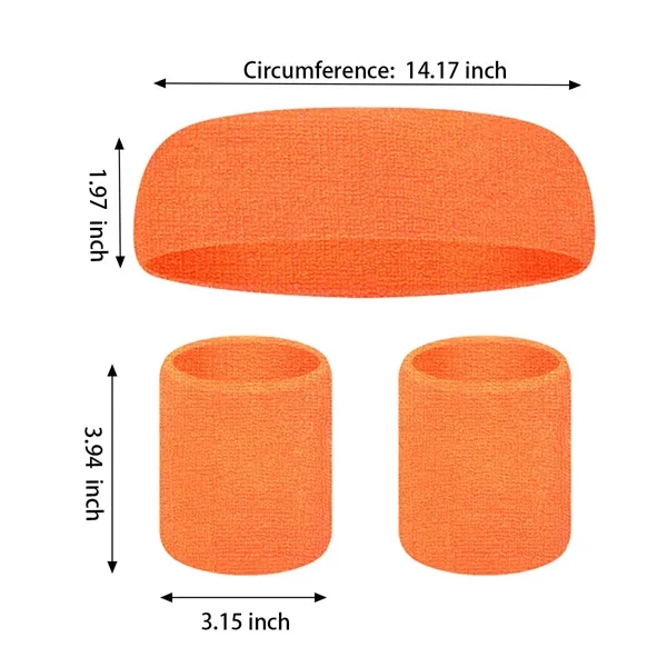 Sweatband Headband & Wristband Combo. This set includes 1 sweat headband and 1 pair of wrist sweatbands, made from 85% cotton, 12% spandex, and 3% nylon for a soft, lightweight, and comfortable fit. The headband has a 14.2-inch circumference with stretch, and the headband measures 7.5" x 2", while the wristbands are 3" x 3.5". These sweatbands are durable and washable, keeping their shape and color. The headband efficiently absorbs sweat, keeping it and messy hair away from your eyes, while the wristbands help wipe sweat from your face. Ideal for sports like basketball, tennis, running, and yoga.