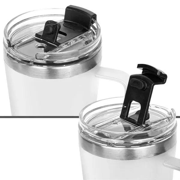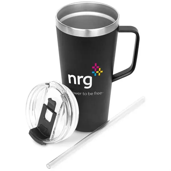 Stay refreshed all day long with this amazing 30 oz. tumbler! This double-wall stainless steel mug features vacuum insulation to keep your drinks icy cold for up to 11 hours and piping hot for up to 7 hours. The soft matte finish with a durable powder-coated finish provides a comfortable grip, while the rubber bottom keeps it stable on any surface. The mug comes complete with a pull-off clear straw lid with secure seal, a dual flip closure for easy sipping, and a reusable straw for eco-friendly convenience.