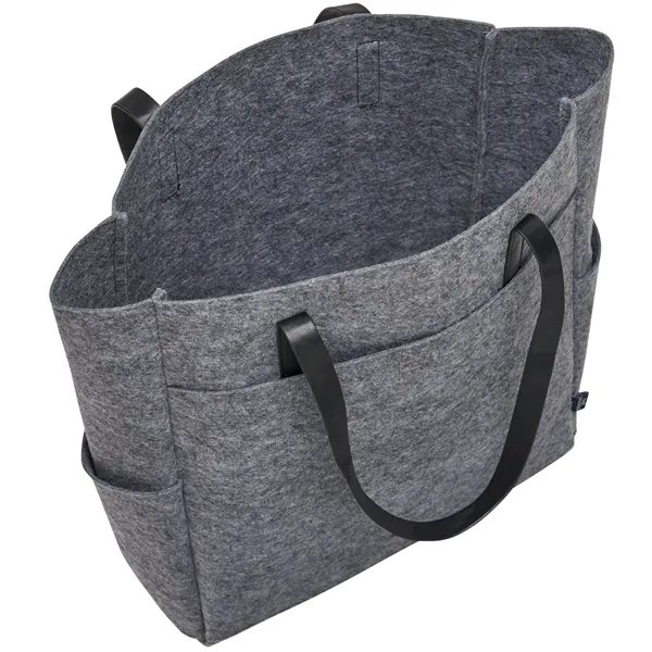 Transform your brand's presence with The Goods recycled felt collection, crafted from a stylish, durable material that showcases your commitment to sustainability. This tote boasts a spacious main compartment, complemented by recycled vinyl carry handles for effortless transport of all your daily essentials. Additionally, it includes a front pocket with a secure hook-and-loop closure for accessories, plus dual side pockets for quick access to your phone or water bottles. By choosing this eco-friendly tote, you're not only promoting your brand but also supporting environmental initiatives - 1% of sales from this item and all EcoSmart products will be donated to environmental nonprofits through our partnership with 1% For The Planet.