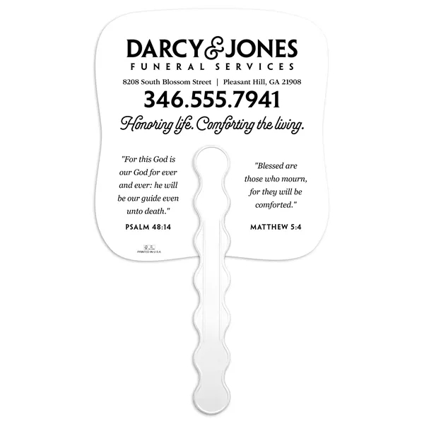 Stay cool and spread your message with this beautifully designed hand-held paper fan featuring an uplifting image on the front and your imprint on the back. Perfect for so many occasions, it combines practicality with a meaningful message, adding elegance to your event while keeping attendees feeling refreshed. The FSC® label means that the materials used for this product come from well-managed FSC®-certified forests and other controlled sources.